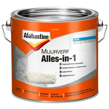 Alabastine muurverf Alles-in-1 wit mat 2,5 liter voorkomt afbladderen en loslaten van verf en bedekt blijvend alle hardnekkige vlekken. De verf is ideaal voor het renoveren van oude muren en plafonds en is te gebruiken op poederende lagen, dunne lagen veegvast en witkalk, oude muurverflagen en oude ondergronden. De Muurverf 2in1 Renovatieverf dekt in 1 laag en heeft een helder witte matte kleur. Alabastine muurverf 2in1 renovatie is gebruiksklaar en hoeft niet meer verdund te worden. De inhoudsmaat is 2,5 liter.