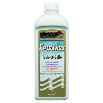 Epifanes Teak-O-Bello is een watergedragen beschermingsmiddel voor teak en voorkomt voor langere tijd vergrijzing. Het product is snel en eenvoudig aan te brengen en voor komt schimmelvorming. In tegenstelling tot vele teakolies tast Teak-O-Bello de kitnaden in teakdekken niet aan. Geschikt voor zoet en zout water maar boven de waterlijn. De inhoudsmaat is 500 milliliter.