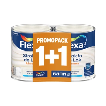 Flexa Strak in de lak zijdeglans in de kleur RAL 9010 gebroken wit zijdeglans 750 ml is geschikt voor binnengebruik. De watergedragen lak is toepasbaar op hout en i.c.m. de juiste grondverf ook op metaal en harde kunststoffen. Gebruik Flexa Strak in de lak zijdeglans bijvoorbeeld voor het lakken van uw kozijnen of deuren. De zijdeglans lak van Flexa Strak in de lak heeft een optimale dekking en is krasvast. Bovendien is de lak sneldrogend, geurarm en niet vergelend. De inhoudsmaat is 750 ml +750 ml gratis.Â