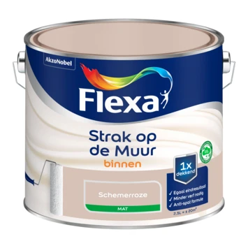 Flexa Strak op de muur Schemerroze mat 2,5 liter is een matte finish. De muurverf heeft een hoge kleurkwaliteit, is watergedragen en eenvoudig aan te brengen. Flexa muurverf Strak op de Muur is geschikt voor alle muren en plafonds binnenshuis, ook voor de badkamer en keuken. De inhoudsmaat is 2,5 liter. Naast de standaard beschikbare kleuren is deze verf in meer dan 30.000 verschillende kleuren te verkrijgen bij onze verfmengbalie in de GAMMA bouwmarkt.