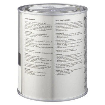 Voor een optimaal resultaat van de GAMMA binnenlak behandel je de ondergrond eerst met de GAMMA grondverf voor binnen. Het blik heeft een inhoud van 750 milliliter, dit is voldoende voor een oppervlakte van ongeveer 9 m². Een uur na het aanbrengen van de verf is deze reeds stofdroog, na 20 uur kan je de volgende laag aanbrengen. Verwerk de verf bij temperaturen tussen de 8 en 25°C.