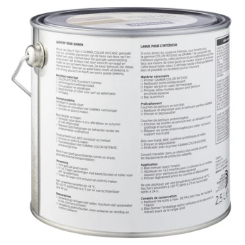 Voor een optimaal resultaat van deze GAMMA Color Intens binnenlak behandel je de ondergrond eerst met de GAMMA Color Intens grondverf. Het blik heeft een inhoud van 2,5 liter, dit is voldoende voor een oppervlakte van ongeveer 25 m². Drie uur na het aanbrengen van de verf is deze reeds stofdroog, na 24 uur kan je de volgende laag aanbrengen. Verwerk de verf bij temperaturen tussen de 8 en 25°C.