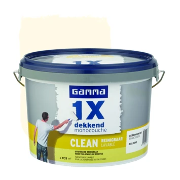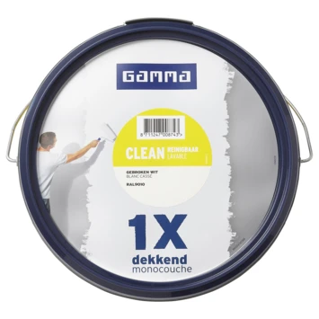 GAMMA 1x dekkend muurverf Clean is een optimaal dekkende, uitstekend reinigbare, matte latexverf. Vuil en vlekken op de muur laten zich met een vochtige doek gemakkelijk verwijderen zonder dat er glimmende plekken overblijven. Ideaal voor muren in vuilgevoelige ruimtes binnenshuis zoals hal, kinderkamer en woonkamer. Reukarm, ademend en gemakkelijk aan te brengen. Afhankelijk van de kleur en kwaliteit van de ondergrond dekt deze verf in één laag. Is je muur nog onbehandeld? Gebruik dan voorstrijk voor een optimaal dekkend resultaat. Deze emmer van 2,5 liter is voldoende voor het schilderen van circa 17,5 m². Verkrijgbaar in wit en RAL 9010.
