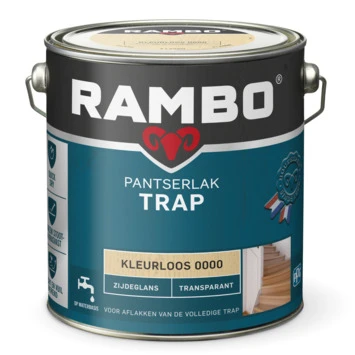 Houten trappen hebben het extra zwaar, speciaal daarvoor is er extra sterke Rambo Pantserlak Trap. De lak is extra snel droog, geurarm en vergeelt niet. Ook is de lak zeer kras- en slijtvast, vloeit mooi uit en beschermt jaren met een blijvende zijdeglans. Geschikt voor de gehele trap (trap – en trapopbouw). Het rendement van dit product is 12 m2 per liter.