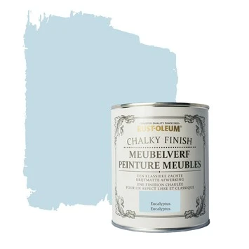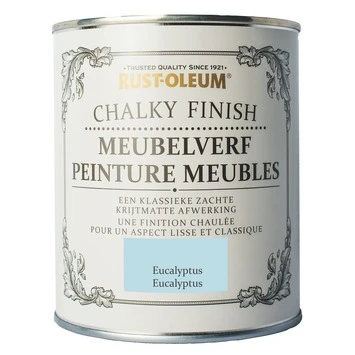 Rust-Oleum Meubelverf Eucalyptus 750 ml is perfect om meubels een nieuwe uitstraling te geven. De verf mag rechtstreeks op hout (blank of geverfd), baksteen, tegel, pleister of elk ander voorbehandeld hard oppervlak worden aangebracht. Creëer een vintage look door twee lagen in contrasterende kleuren aan te brengen en deze zacht op te schuren wanneer de verf droog is. Werk voor het ultieme resultaat de Rust-Oleum Meubelverf Eucalyptus 750 ml af met een beschermende laag Rust-Oleum Meubelwas of Rust-Oleum Meubelvernis mat.