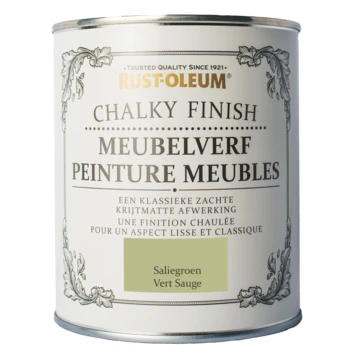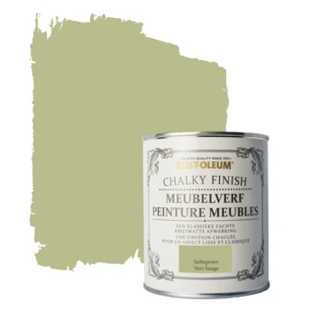 Rust-Oleum Meubelverf Salie groen 750 ml is perfect om meubels een nieuwe uitstraling te geven. De verf mag rechtstreeks op hout (blank of geverfd), baksteen, tegel, pleister of elk ander voorbehandeld hard oppervlak worden aangebracht. Creëer een vintage look door twee lagen in contrasterende kleuren aan te brengen en deze zacht op te schuren wanneer de verf droog is. Werk voor het ultieme resultaat de Rust-Oleum Meubelverf Salie groen 750 ml af met een beschermende laag Rust-Oleum Meubelwas of Rust-Oleum Meubelvernis mat.
