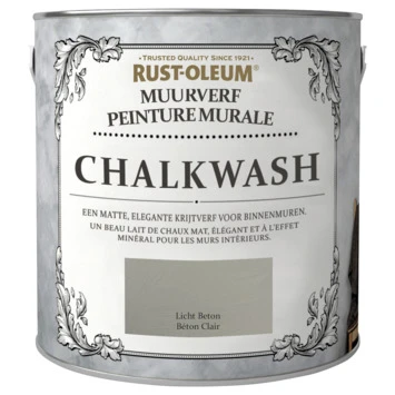 Rust-Oleum Muurverf Chalkwash Licht Beton 2,5 liter is perfect om je muur een speciale uitstraling te geven. De elegante matte krijtverf is een verf op waterbasis en dus geurarm, maar wel heeft wel een betere waterbestendigheid ten opzichte van de traditionele krijtverf! De verf kan rechtstreeks aangebracht worden op de meeste ondergronden, zoals pleisterkalk, beton of baksteen – een voorstrijk is dus meestal niet nodig. Creëer een krijtachtig mineraal effect door de tweede laag kriskras aan te brengen met een blokkwast. Door de goede krasbestendigheid is het niet nodig om de verflaag te beschermen met een vernis. Combineer de decoratieve muurverf Chalkwash Licht Beton met een bijpassende muurverf Chalky Finish voor een complete interieurtransformatie.