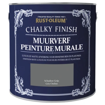 Rust-Oleum Muurverf Chalky finish Schaduw Grijs 2,5 liter is perfect om bijvoorbeeld de muren van je woonkamer een nieuwe kleur te geven. De luxueuze gladde en krijtmatte afwerking is op waterbasis en dus geurarm. De verf kan rechtstreeks aangebracht worden op de meest voorkomende ondergronden, zoals pleisterkalk, beton en baksteen – een voorstrijk is dus meestal niet nodig! Chalky Finish is heeft een duurzame afwerking en is goed bestand tegen slijtplekken en vlekken. Combineer de Chalky FInish muurverf Schaduw Grijs met een bijpassende Chalkwash kleur voor een complete interieurtransformatie.